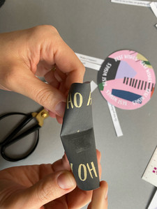 Einen kleinen Streifen doppelseitiges Klebeband abschneiden (ca. 1cm) und auf die unbedruckte Seite an den Rand kleben.